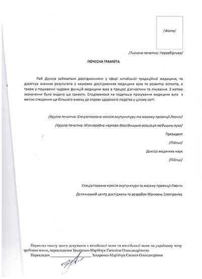 Доктор Пей Дунхуа народився у сім'ї спадкового лікаря, тому багато своїх знань перейняв саме від батька. Глибокі знання в області пульсової діагностики й іридодіагностики, великий досвід у застосуванні голкорефлексотерапії та інших методів східної медицини дають можливість робити людей здоровими й щасливими,а на рахунку спеціаліста вже безліч зцілених людей.
